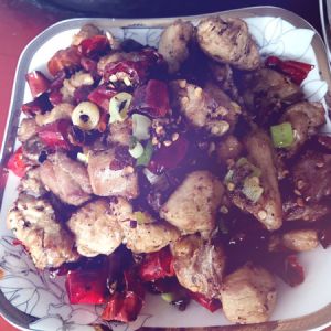 鸡肉切成小块,洗净,加入料酒,姜蒜,花椒粉,盐,老抽,淀粉各一点点!拌匀腌制二十至三十分钟!鸡肉选鸡腿肉或者鸡胸肉比较好!