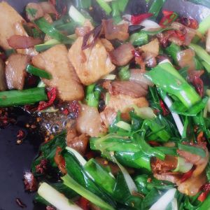 另起锅,倒油炒蒜苗(这样做出的回锅肉比较干,好吃)