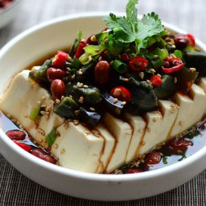 蒸好的豆腐冷却,切片,放上切碎的皮蛋,再淋上调味汁即可。