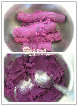 紫薯洗净,上锅蒸熟,将蒸熟的紫薯去皮,放入小盆中,用勺碾碎,加入牛奶、炼乳,继续碾成泥状;