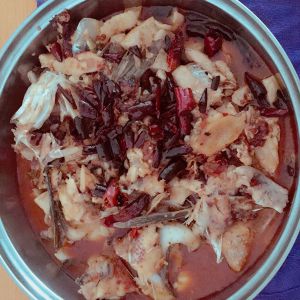把鱼倒入盆内。上面放去籽辣椒段,用一点五香油热了之后泼再辣椒上,完事。