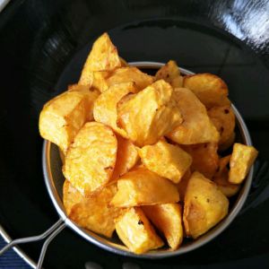 炸至地瓜熟透金黄表皮,捞出控油