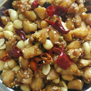 炒锅放少许油,放入辣椒段、花椒、芝麻,小火慢慢炒微焦,然后倒入炸好的鸡丁翻炒一会,再加入花生米炒两下出锅。