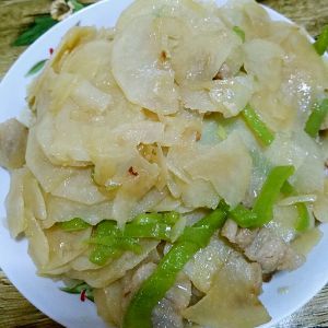 加入尖椒翻炒两分钟,再放土豆片翻炒,半熟时倒入一点凉开水,炒八分熟后放少许盐。