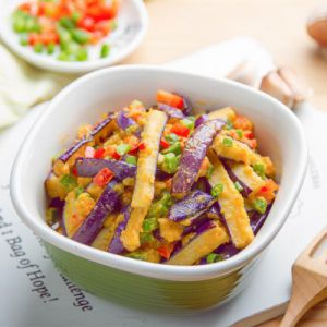看到咸蛋黄起小沫子了,就可以下茄条了,翻炒均匀,让切条表面都均匀的裹上咸蛋黄。蛋黄酱的味道够了就不用再额外加盐了。