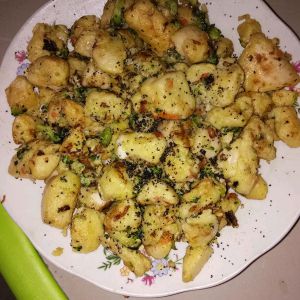 锅里放油,把西兰花,胡萝卜炒熟,再把馒头丁放入炒熟