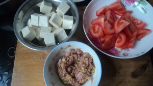 肉末添加少许姜末、白砂糖、生抽、老抽少许拌匀腌制约10分钟备用;西红柿洗净去除蒂根部后切块备用;豆腐块稍加冲洗后,放入加盐的水中浸泡, 将浸泡后的豆腐块控水切块状备用