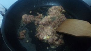 锅内留底油,将蒜末、姜末下锅煸香,下腌制好的肉末炒散;