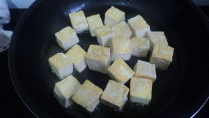 锅烧热,注入适量植物油,将豆腐块排入锅中,中小火煎至金黄香酥,翻面,将两面煎至金黄色盛出备用;