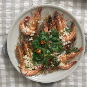 粉丝铺好后放好虾,浇上酱油、油、鸡精和盐,再将蒜蓉和辣椒铺在虾上