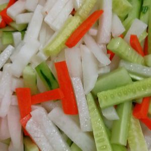 我是喜欢吃黄瓜,所以就放了两根,其实这个很随意,看你自己喜欢。然后分别把胡萝卜和白萝卜切成条,最好不要太厚太大。均匀一点。