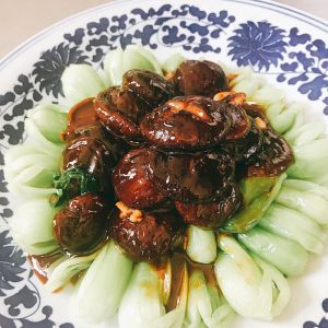 锅中倒油,放入蚝油、蒜瓣,加少许水翻炒,倒入香菇,倒入酱油、盐、味精,水淀粉翻炒到粘稠状态即可出锅