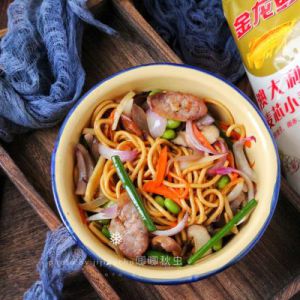 锅里下油,油要略多,后面还要炒面。将锅烧热后,放入腊肠、胡萝卜、笋丝炒至稍软,再将香菇、洋葱一起下锅炒,家里还有煮熟剩下的小青豆我一起下锅炒了,下配菜的原则就是,不容易熟的先下如胡萝卜丝、笋丝、腊肠先下,香茹和洋葱后下一起入锅炒。