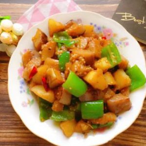 锅内留底油,放土豆,茄子,青椒炒熟,加盐,蚝油调味