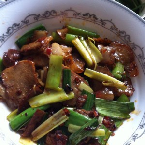 倒入回锅肉片翻炒,烹入料酒和生抽。