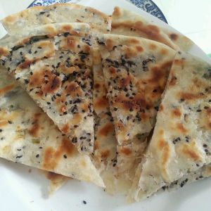 面团醒好后,擀成一个圆饼,然后在面饼上刷上刚刚调好的葱油,撒上芝麻,我这芝麻撒的有点多而且是黑芝麻,看起来有点那个啥(≧∇≦)有密集恐惧症的看着估计有点难受