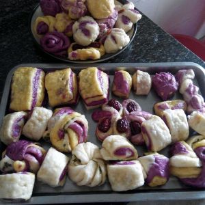 分别用紫薯泥和红薯泥,和白糖,发酵粉发面,白色面团是只放水和白糖还有发酵粉。每三斤面粉放一汤匙发酵粉。水就自己适量的放。