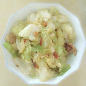 然后就是放包菜了,包菜不要太多,不停地翻炒,大概7成熟的样子,不要等包菜变得烂烂的,7成熟的时候放酱油和醋,量按照包菜地量大约估算一下就可以了,不用那么精细,醋的话,不要直接倒在菜上,沿着锅边到下去,然后就是不停地翻炒了