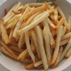 我这是冻了一晚 拿出来凉一会 稍松动一些就可以炸了 油多放 待油七分热时再放薯条 千万别太热了炸 否则薯条容易糊 发黑的