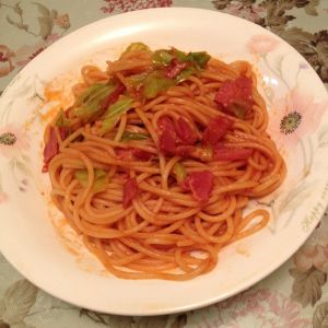 油热后先后倒入培根和包菜翻炒,再加入意大利面酱,煮沸后放入面条搅拌后出锅