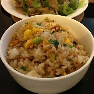倒入米饭翻炒打散,加入煎好的鸡蛋,顺势用锅铲将鸡蛋分成小块