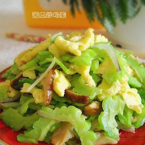 1. 准备好苦瓜、水发香菇、鸡蛋、洋葱、蒜。
