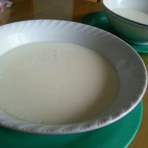将混合物小心地倒回有奶皮的碗里。从戳破的地方倒下去,让奶皮飘在上面。