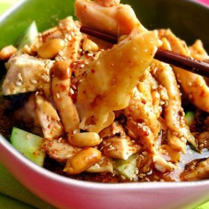 最后把、鸡肉斩块,把调好的汁浇在上面,拌匀后进冰箱冷藏30分钟就可以吃了,辣辣麻麻的很好吃。