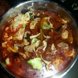 热锅放入俩勺油,放入葱段,姜片,干辣椒炸锅。然后放入郫县豆瓣酱和大红袍,小火炒化。
