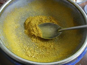 过筛,将粗粒重新放入料理机研磨。重复两三次就能得到比较细腻的咖喱粉。