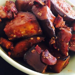 豆瓣炒香后下青椒呛锅。然后下入脱水后的茄子一起炒