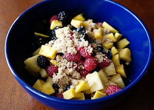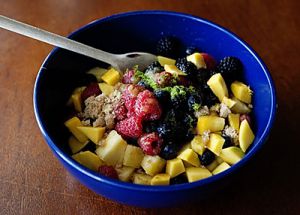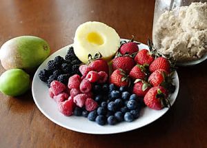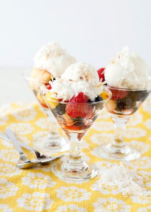 水果铺在下面,放上冰淇淋,撒点椰丝(有花生会更棒哦^^)