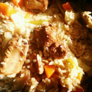 排骨腌好热油小火两面煎一下(平时炒菜的油量就行),另起锅葱蒜炝锅放土豆胡萝卜煎好的排骨,放入冰糖香菇翻炒一会儿,放比平时多的盐。和大米一起放进电饭煲里搅匀后煮饭键ok
