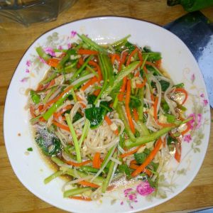 依次放入之前准备好的胡萝卜,青椒,香菜和蒜未,再倒入调好的料汁!最后滴上几滴香油,拌匀即可!