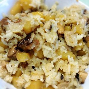 炒糯米的时候忘记拍照了,所以上成品图糯米需要提前一夜泡好,锅里热油放些蒜沫把滤水的糯米倒入锅中炒,边炒边加入适量开水闷五分钟,直到糯米变的晶莹剔透,再把之前的香菇土豆肉倒入米饭里加入适量盐鸡精香油就可以开动咯。
