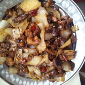 先把羊肉下锅,金黄色以后,倒出来。再把孜然放到热锅里面干炒,香味以后放入炒制一半的肉,孜然粒滚到羊肉上以后,再放洋葱和葱,加点盐就好了