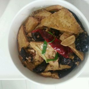 放入蒜片和炸好的豆腐,加入盐,酱油,糖,干辣椒,泡发的木耳翻炒,让豆腐上色。加入清水淹没豆腐转小火炖。