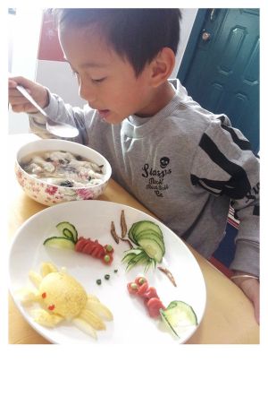 香肠切四个小圆片,其余的切斜刀,微波2分钟取出,切斜刀的香肠再切成两段,分别做鱼身,四个小圆片做鱼眼,取四颗蚕豆,放在小圆片香肠上,做鱼眼。黄瓜切成水草,摆上几个小鱼干