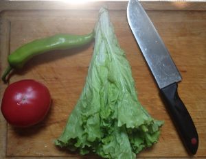 蔬菜洗净!生菜切粗丝,也可手撕,看你心情!尖椒去芯,切丝!西红柿切小块!