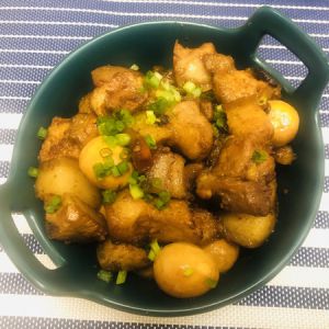 哈哈,这步无图,因为忘记拍照!起锅热油,下辣椒蒜片爆香再下其他杂七杂八的配料一起爆香,最后下靓靓腩肉块爆炒,下蛋继续炒,最后下点生抽和蚝油,加点热水焖到收汁即可!