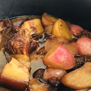 一个半小时后,加入切成滚刀块的小萝卜翻炒,继续焖煮20~30分钟,让萝卜吸收肉的鲜香。