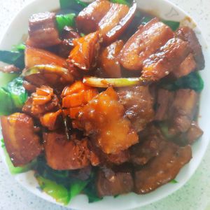 肉炖了半个多小时可以放入鲍鱼一并炖煮了,海参是最后收汁时放入的,因为海参很容易炖烂哒,切记。最后就收汁装盘啦,刚刚的青菜铺在盘子最下面哦