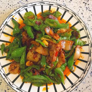 大火加入肉片爆炒,加入一半青椒,再放老抽生抽,胡椒粉