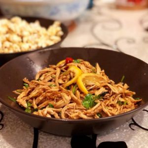 捞出过冷水,晾凉。顺着纹路撕成一丝丝备用