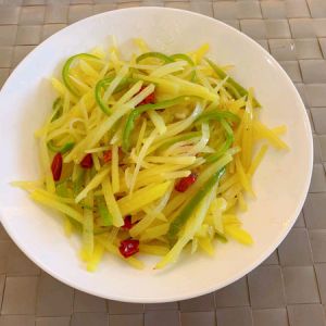 下入土豆丝快速翻炒,土豆变色后加入适量盐,加入2勺白醋,等醋味挥发后便可出锅装盘