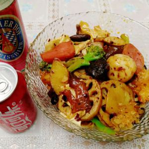 土豆片过油,豆皮火腿羊肉卷不用处理直接炒即可