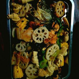 我简略了一步(锅中放适量的水,加入烤鱼料或者麻小的料,然后一些难煮的菜提前依次放入煮)把汤和菜倒在鱼的上面,最后放香菜和芝麻