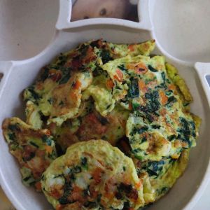 将蔬菜碎,虾肉放入小碗,打入三颗鸡蛋,适量盐,搅拌均匀