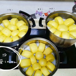 放入蒸笼中第二次发酵,蒸笼层下倒入温水发酵半个小时至1小时候,发酵后也会变大