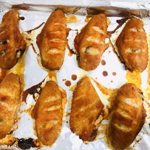 用个小碗放入奥尔良腌料加入一点点水,再加点料酒拌均洒在鸡翅上,戴上一次性手套给鸡翅按摩一下,让它入味,腌制30左右,其实时间越久会更入味!最后把鸡翅放在烤盘上用刷子刷上一层薄薄的蜂蜜,就好啦!
